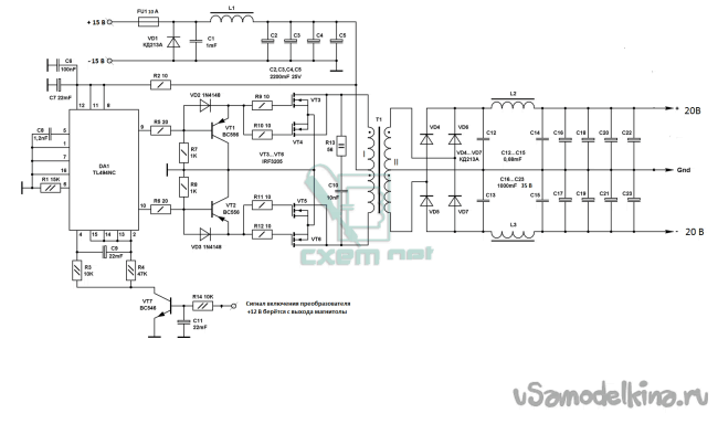 Дальше немного погу-у-глив я нашёл не сложную схему нужного мне преобразователя на TL494, тем более что с работой этого ШИМа я хорошо знаком по переделке компьютерного БП в зарядное для АКБ с защитами.