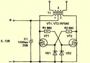 ШИМ заработал и на его 9 и 10 ногах появились ШИМ сигналы с максимальным заполнением, в этой схеме нет стабилизации выходного напряжения. Далее ШИМ сигнал поступают через резисторы R5, R6 на простенькие драйвера собранные на R7,R8. VD1,VD2. VT1,VT2, которые быстро разряжают затворы транзиторовVT3,VT5 (в моём случае) при закрытии транзисторов. Эти транзисторы открываются и коммутируют переменный высокочастотный ток в первичной обмотке Т1.