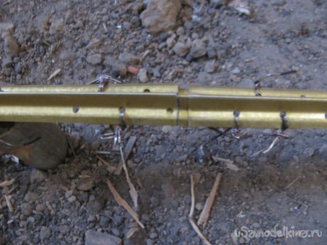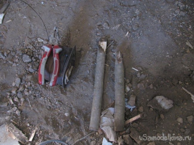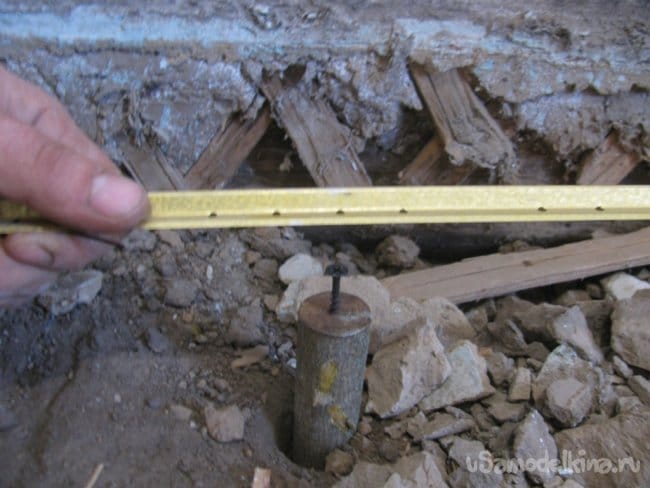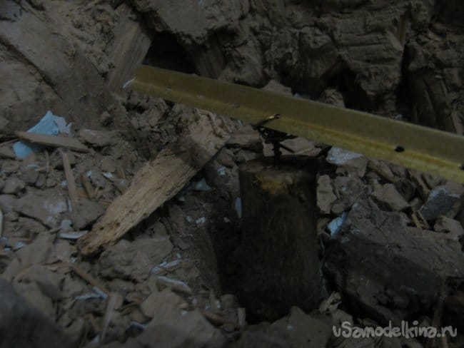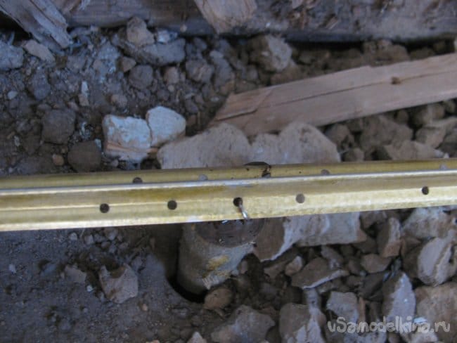 Так вот, полы я заливаю по маякам, маяки устанавливаются на саморезы, а саморезы завернуты в колышки, забитые в подсыпку))) Благодаря саморезам можно четко отрегулировать опоры маяков, а далее маяки прикручиваются проволочкой, у меня она медная от сгоревшего трансформатора.