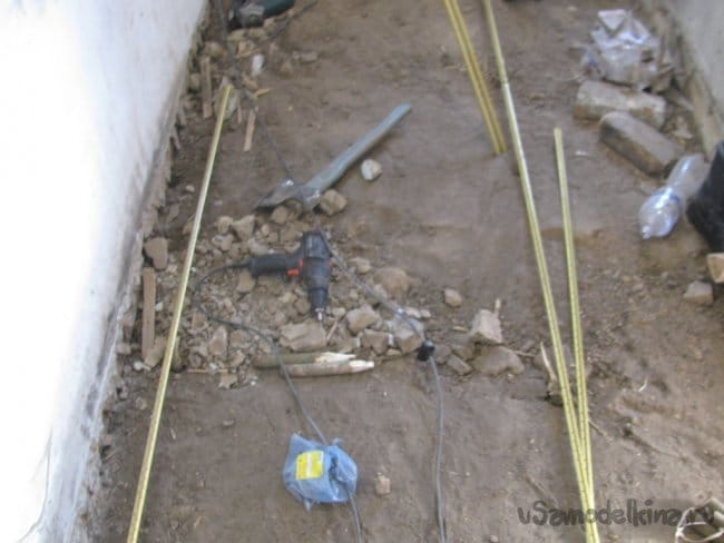 Поскольку с песком у нас беда, приходится и на этом экономить. На пол я высыпаю битый кирпич, обычно в доме его на полу и бью. В итоге расход бетона значительно меньше, а благодаря кирпичу появляются ниши, камеры, которые хоть немного позволяют разделить слой бетона с подсыпкой.
