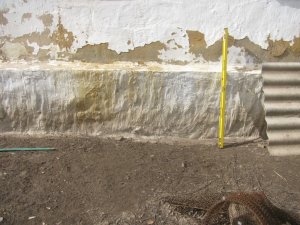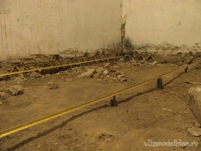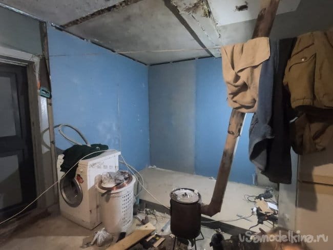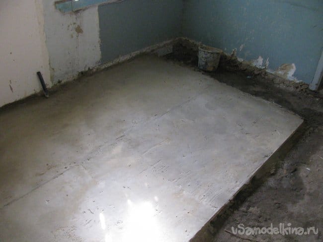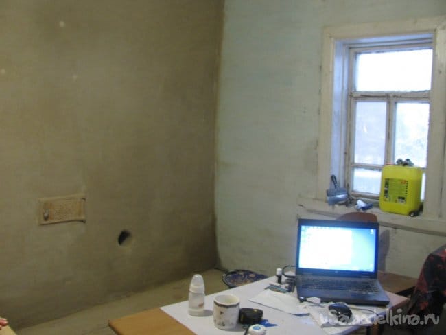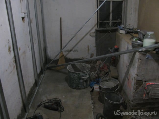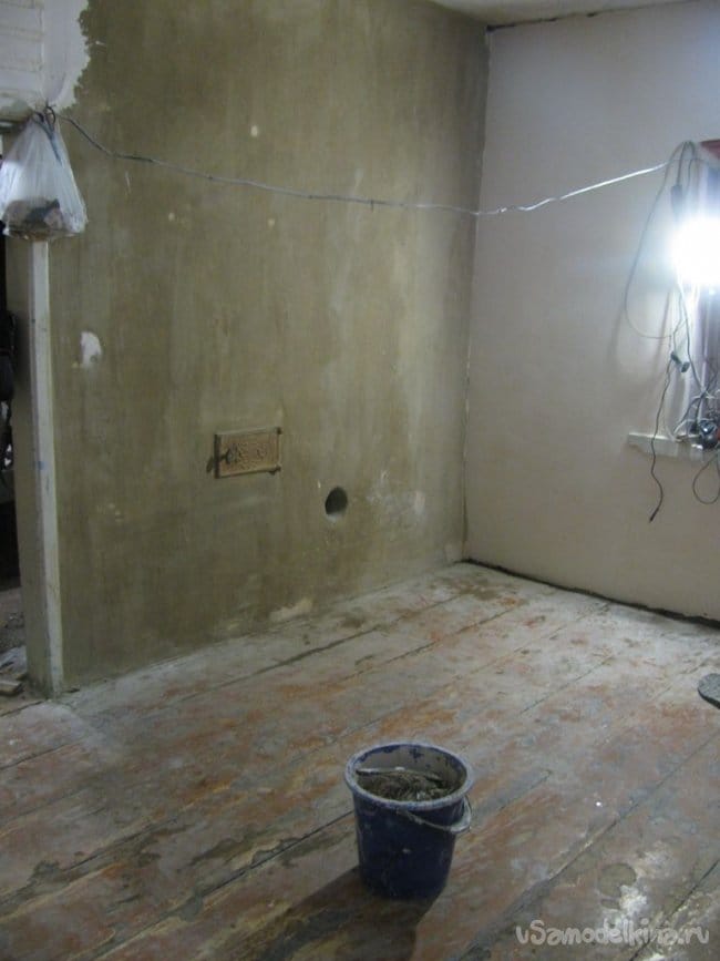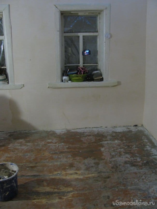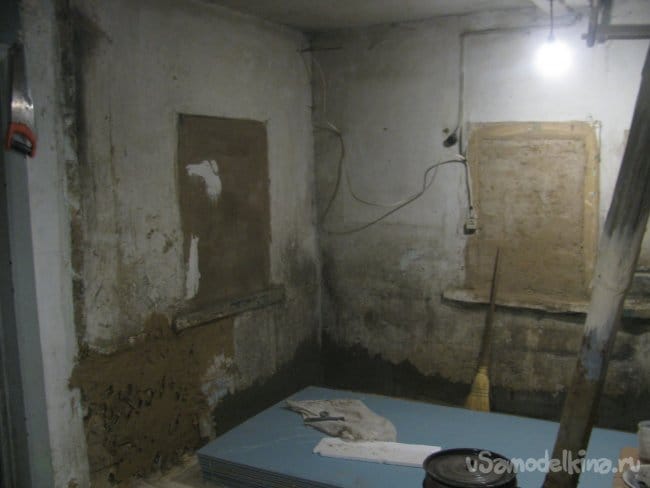 Стены понизу я штукатурю бетоном, отбивая глину, это такой своего рода дополнительный барьер для мышей, если они как-то пролезут под стяжкой и захотят поселиться за моим гипсокартонном.