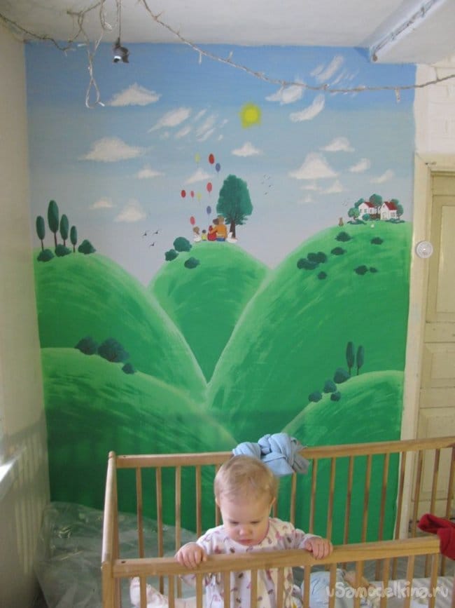 На одной из стен жена заделала вот такой шедевр искусства. Сверху все покрыто акриловым лаком и можно мыть, а краска использовалась водоэмульсионная и красители.