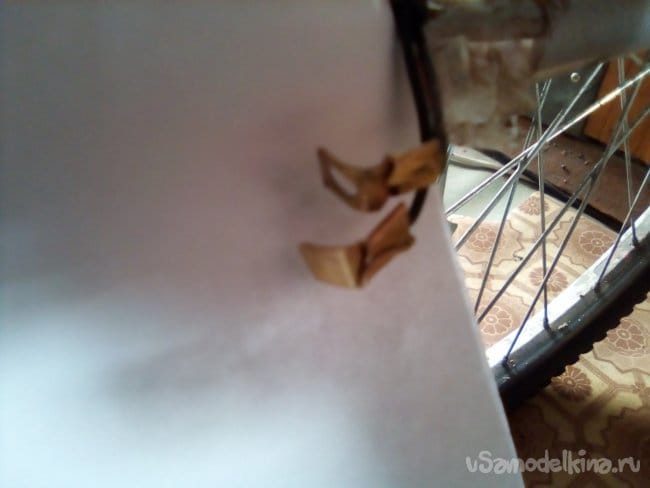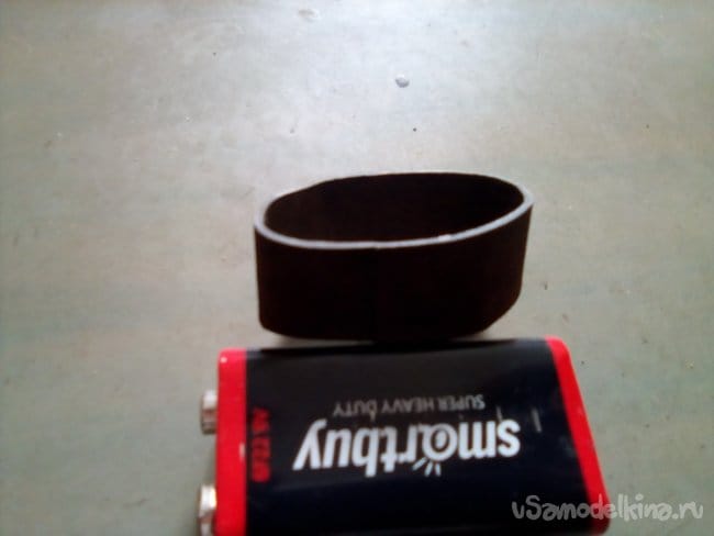 2. Далее занялся батареей. У меня не было в наличии специального для Кроны крепления проводов к ней. По-этому я закрепил контакты проводов с помощью кольца от кусочка камеры велосипеда. Вырезав толщину камеры примерно в толщину Кроны. Саму батарею зафиксировал к перу велосипеда обычным хомутом. Главное не сильно перетянуть винт, чтобы не расплющить батарею.