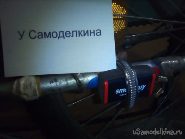 5. Теперь моя конструкция готова для выездов дорожного велосипеда на дороги общего пользования. Так как на дорогах по ПДД важно иметь габаритные огни сзади и спереди. Особенно в тёмное время суток.