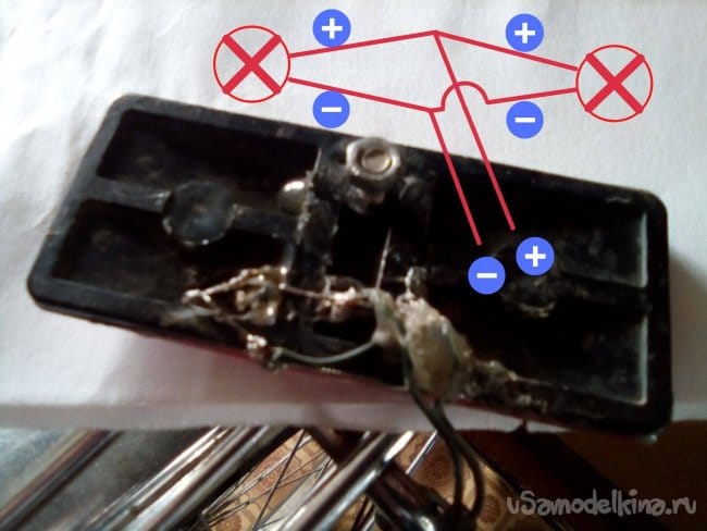 Светодиоды имеют полярность: плюс и минус. Той же Кроной можно определить её у двух светодиодов и припаять их либо последовательно, либо параллельно в цепи. Я сделал параллельно и это помогло мне не переделывать конструкцию, из-за разорванной цепи от второго светодиода. Чтобы сделать параллельное соединение нужно соединить две ножки каждого светодиода одной полярности и эти места будут припаиваться к проводам. Хотя конструкцию можно выполнить и на одном светодиоде. Но так как он должен быть маломощным, чтобы он не перегревался, одного его может не хватать для подсветки велосипеда.