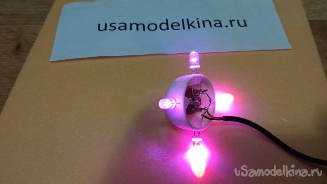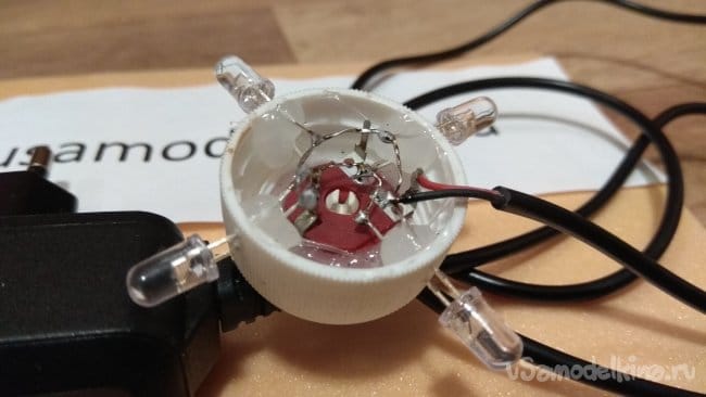 Вклеиваем светодиоды. Я вклеил длинной (плюсовой) ножкой к переменному резистору.