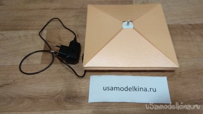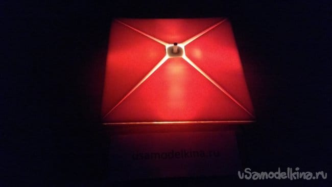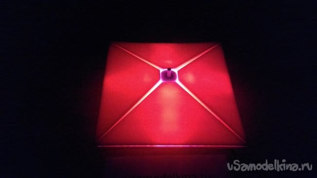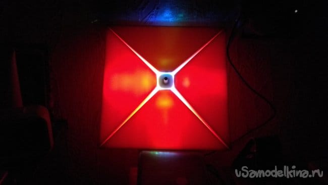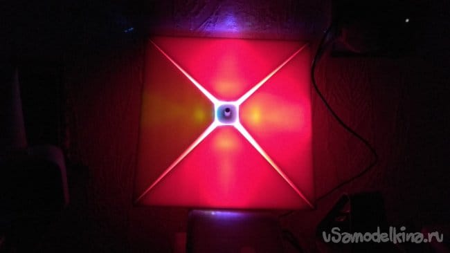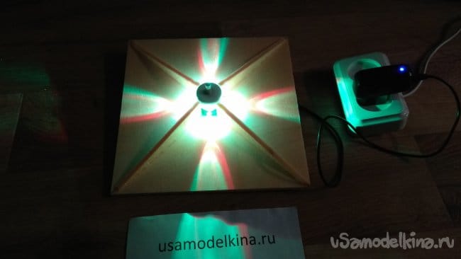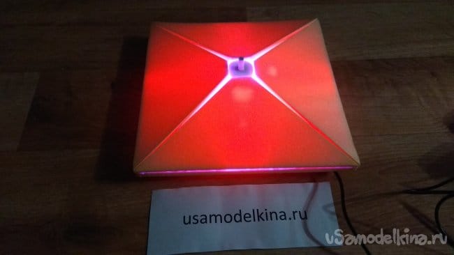 Как светильник сделать еще лучше? Во-первых, пеноплэкс оказался достаточно плотным материалом, который плохо пропускает синий и зеленый свет. Для рассеивателя лучше применить другой материал или делать лист тоньше. Во-вторых, можно установить светодиоды на нижней части основания и создавать дополнительные световые эффекты освещая стену, на которой будет висеть светильник.