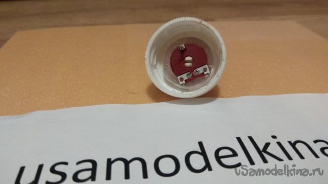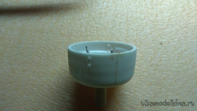 Вклеиваем переменный резистор. Если у вас резистор с гайкой, то просто устанавливаем резистор в пробку и крепим гайкой.