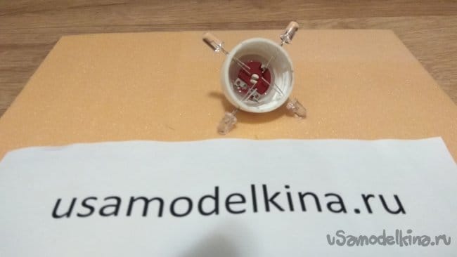 Чтобы свет в каждом секторе был от своего RGB светодиода и не засвечивался соседним, разделяем сектора. Для этого отрезаем от пятимиллиметрового листа пеноплэкса треугольники, затем приклеиваем их термоклеем на основание светильника.