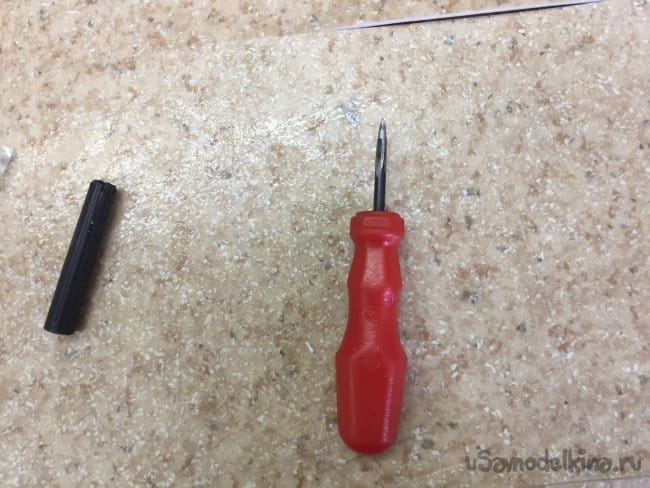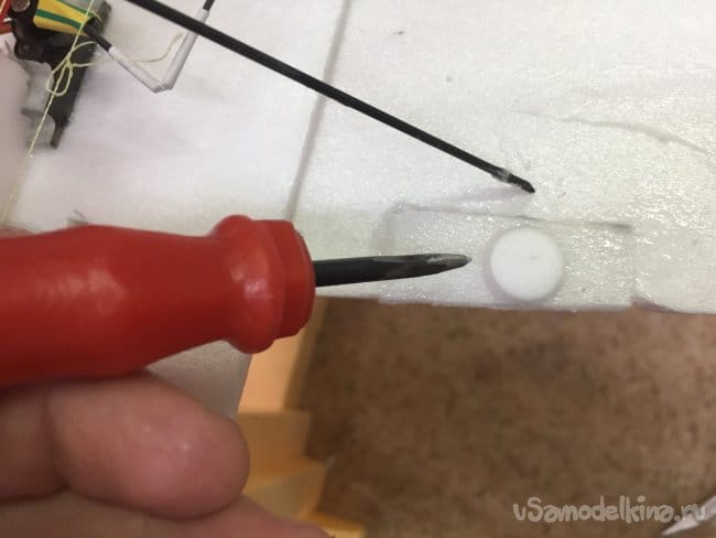 В этот кружок будет вставляться карбоновая шпажка шасси. Шилом проделываю отверстие под шпажку и вклеиваю её.
