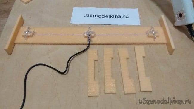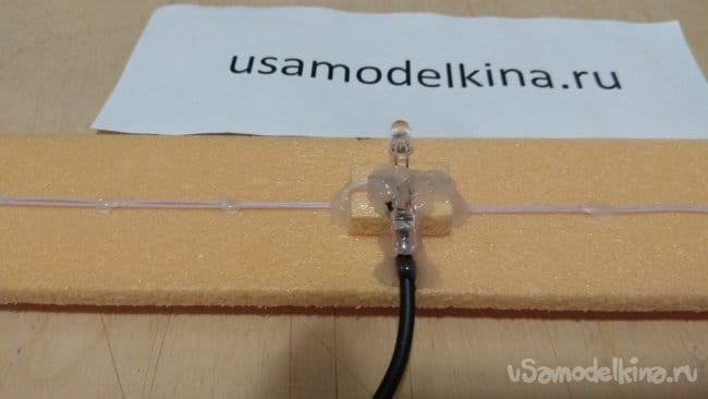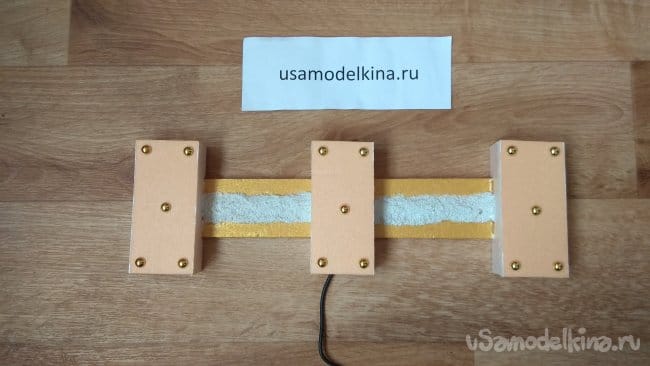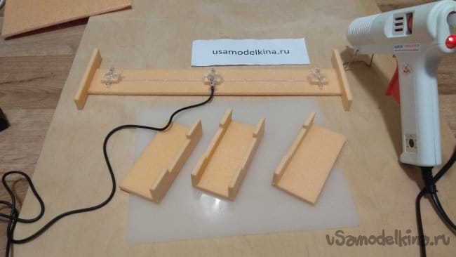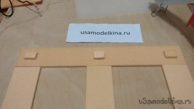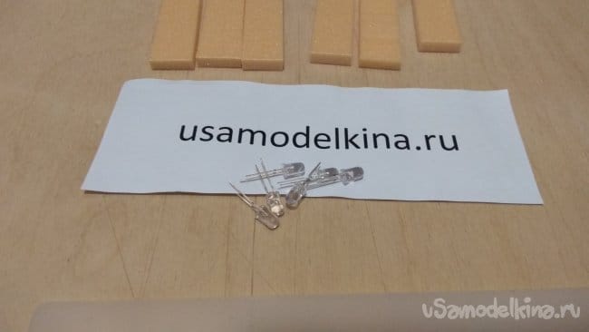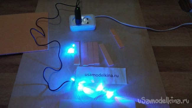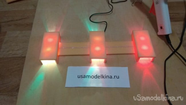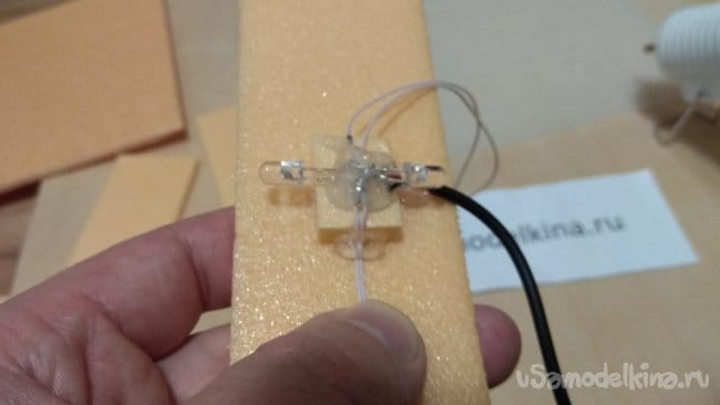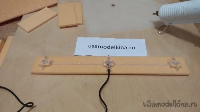 Если приклеить светодиоды прямо на основание, свет будет падать прямо на стену. Приподнимем светодиоды, приклеим на основание три кусочка пеноплэкса.