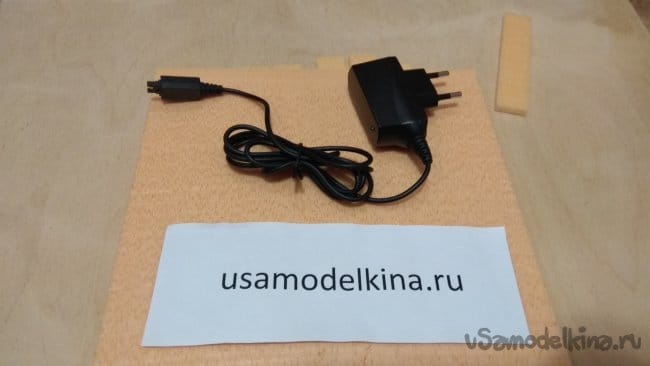 Для питания светильника воспользуемся подзарядкой или любым другим блоком питания с выходным напряжением 5В. У меня купленная на барахолке подзарядка от неизвестного производителя для неизвестного телефона. Она выдает нужное нам напряжение 5В.
