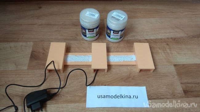 Декорируем соединительные провода. Для этого я воспользовался акриловой перламутровой эмалью «Серебристо-белая» смешанной с кварцевым песком. И то и другое покупал в строительном магазине. Использую эту смесь в различных самоделках для декорирования, выравнивания неровностей, заполнения швов. Песок можно взять и обычный речной, но кварцевый после сушки выглядит красивее.