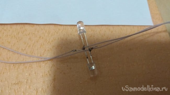 Соединяем пары светодиодов параллельно плюсами к плюсам, минусами к минусам. Напоминаю, длинные ножки плюс.