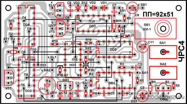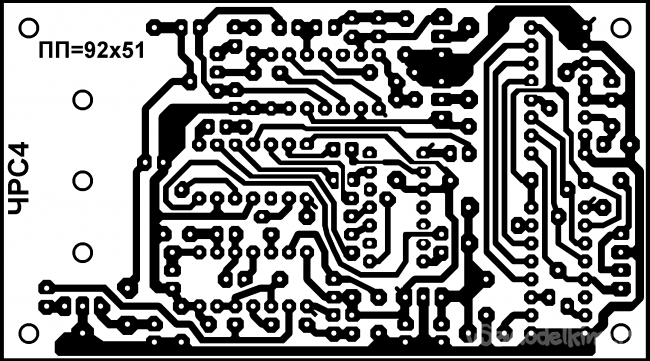 Печатная плата ЧРС4 выполнена из фольгированного стеклотекстолита размерами 92 х 51 х 2 мм (см. рисунок 2). Все резисторы (кроме R4, R6 и R11) на плате устанавливаются вертикально. Диаметр отверстий на печатной плате под микросхемы и перемычки - 0,7 … 0,8 мм, под остальные радиоэлектронные компоненты – 0,8 … 1 мм, под соединительные проводники - 1…1,2 мм,; под крепёжные отверстия – 3,2 мм.
