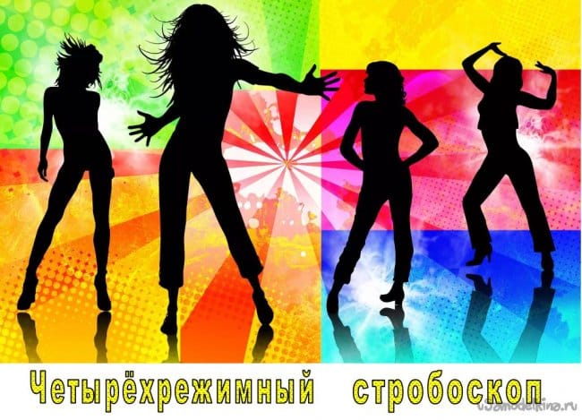 Четырёхрежимный стробоскоп - 4 (далее просто ЧРС4) это малогабаритное устройство, включающее поочерёдно внешнее ЦМУ (цветомузыкальное устройство) и встроенный СДС (светодиодный стробоскоп). Причём, СДС работает на четырёх автоматически чередующихся ступенях с фиксированными частотами: 2, 4, 8 и 16 Герц. Алгоритм переключения частот жёстко задан счётчиком - делителем на 4 и периодически повторяется вплоть до выключения питания ЧРС4. Управляют переключением ЦМУ / СДС (и СДС / ЦМУ) дистанционно при помощи ИК ПДУ. ЧРС4 имеет семиэлементный индикатор «Ступень», который цифрами 0, 1, 2, 3 указывает номер ожидаемой и включённой ступени работы СДС. Цифре 0 на семиэлементном индикаторе соответствует предустановка частоты стробоскопа 2 Герца. Цифре 1 - предустановка частоты 4 Герца. Цифре 2 - предустановка частоты 8 Герц. Цифре 3 - 16 Герц.