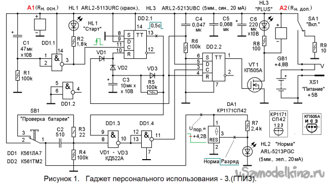 - устройства контроля разряда источника питания, собранного на трёхвыводной ИМС DA1 КР1171СП42 и элементах R7-HL2 «Норма»;