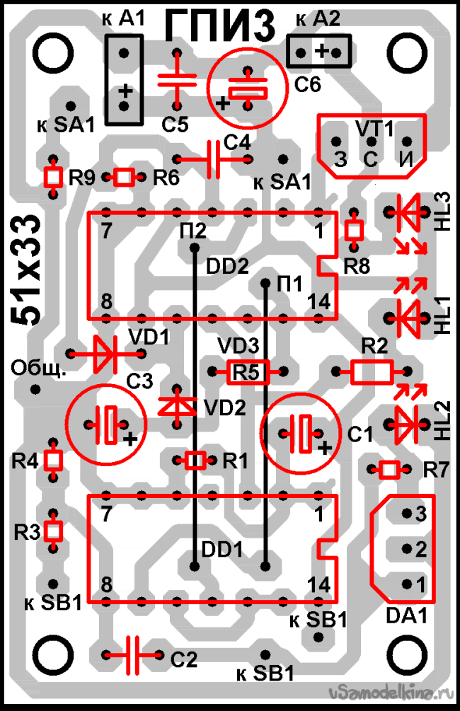 Диаметр отверстий на печатной плате под микросхемы и перемычки - 0,7 … 0,8 мм, под остальные радиоэлектронные компоненты – 0,8 … 1 мм, под соединительные проводники - 1…1,2 мм, под крепёжные отверстия – 3,2 мм. Примечание: Для уменьшения размеров печатной платы диод VD3 собственного «посадочного» места не имеет и располагается над резистором R5.