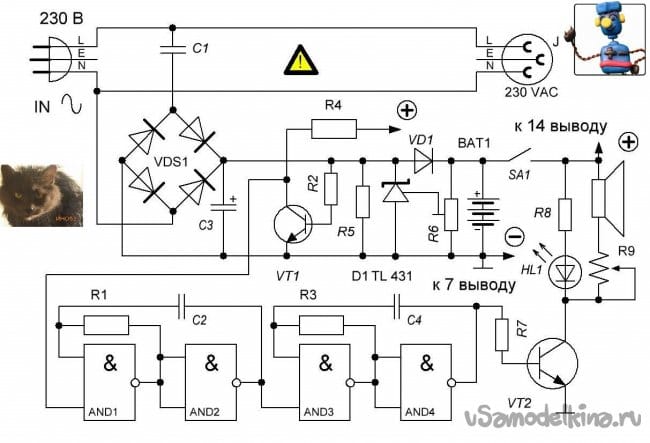 Через конденсатор С1 и мостик при подключенной сети происходит постоянная зарядка АКБ ВАТ1, при этом микросхема TL431 в роли регулируемого стабилитрона ограничивает напряжение на уровне 4,0…4,1 В. Ток зарядки определяется конденсатором С1 и не превышает нескольких миллиампер, что при постоянном, не ограниченном по времени включении вполне достаточно. Собственно генератор прерывистого звукового сигнала собран на микросхеме К561ЛА7, выход усилен транзистором 2Т630Е, для ограничения громкости использован резистор R9. При наличии напряжения в сети транзистор VT1 открыт сетевым напряжением через резистор R2, логический «0» на его коллекторе блокирует работу микросхемы. При пропадании сетевого напряжения транзистор VT1 запирается, логическая «1» на его коллекторе разрешает работу звукового генератора, раздается прерывистый писк. Когда надоест, можно отключить с помощью SA1.