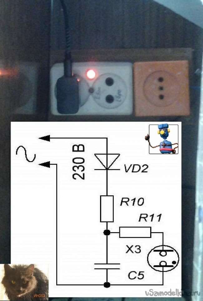Этот сигнализатор был изготовлен по заказу как приставка к удлинителю, в который включаются переносные устройства для зарядки их аккумуляторов (АКБ). При отсутствии напряжения в сети (или ошибочном отключении из розетки) он раз в несколько секунд издает кратковременный противный писк. С разработкой схемы проблем не было, что-то подобное приходилось делать.