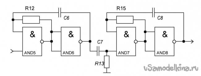 В первоначальную схему были внесены изменения. Этот фрагмент схемы за счет дифференцирующей цепочки обеспечивает высокую скважность выходного сигнала (короткий и сравнительно редкий писк).