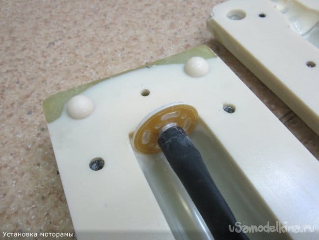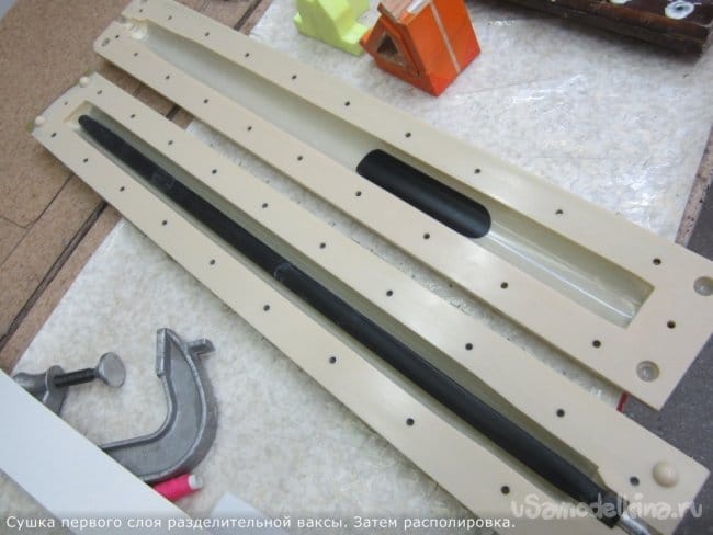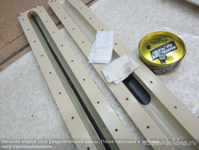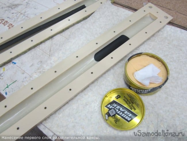 Первое движение укрепляем в форме шаблон крышки в приборный отсек фюзеляжа. Затем начинаем натирать форму разделительной мастикой.