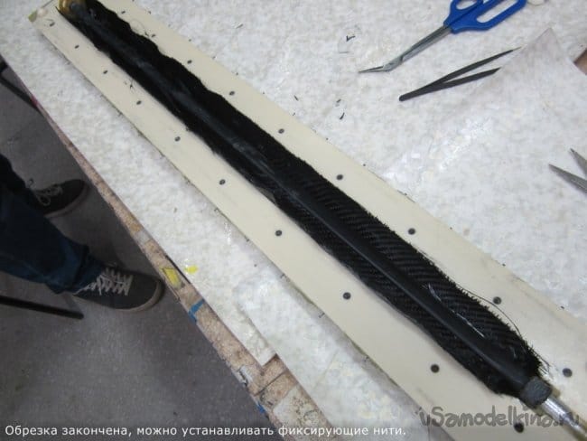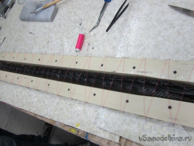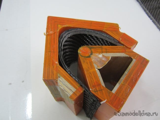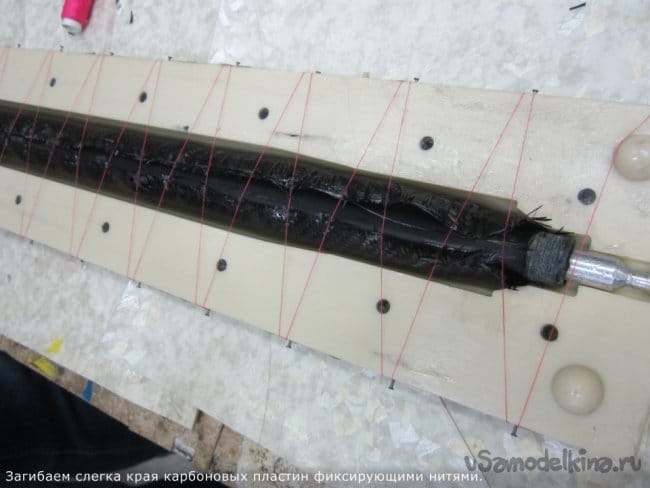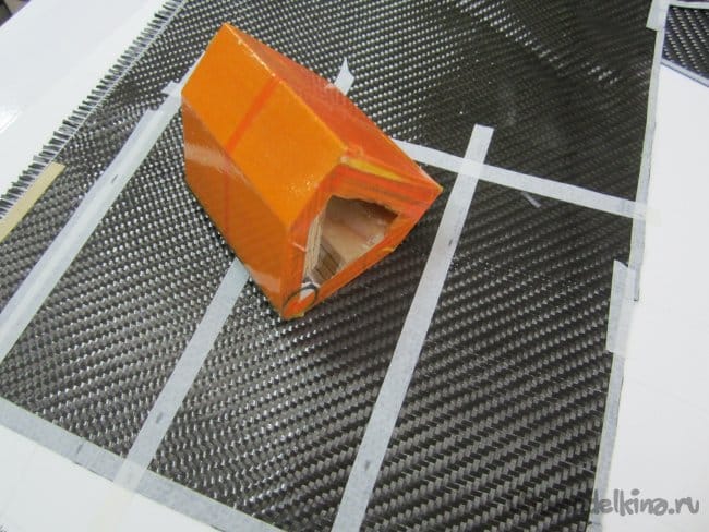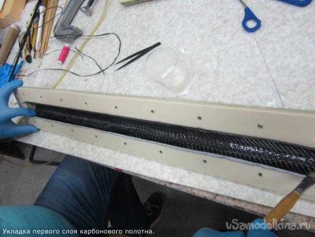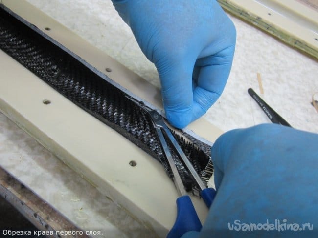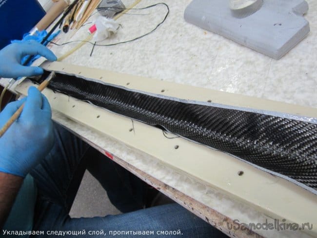Слой смолы, затем заготовка карбона еще смола и карбон, набираем нужное количество слоев и затем укладываем усиления. Тщательно прижимаем слои карбона не допуская воздушных прослоек.