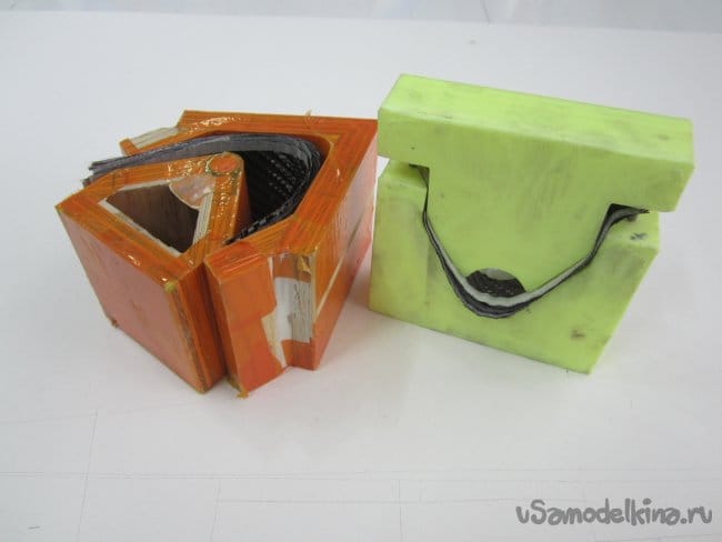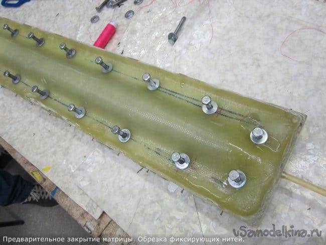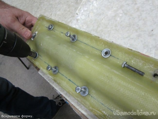 С одной половины формы отрезаем карбон заподлицо с краями. Края карбона на второй части формы заворачиваем внутрь и пригибаем нитками. Нарываем второй половинкой формы. Извлекаем нитки. Когда мешок внутри распрямится от давления слои карбона лягут друг на друга и склейка будет по шву. Слегка прикручиваем болтики и извлекаем нитки из формы.
