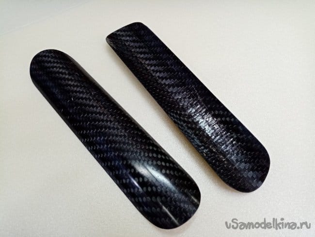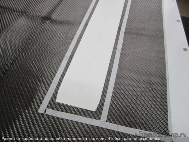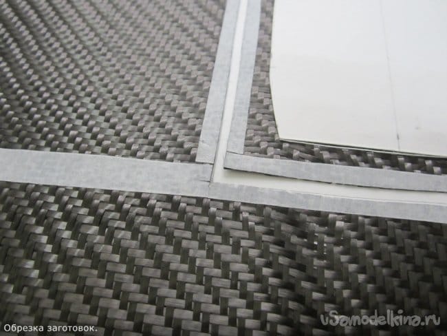Теперь нужен раскрой карбоновой ткани. Из плотной бумаги вырезаю шаблон в точный размер. Ткань размечаем с небольшим запасом на подгиб.