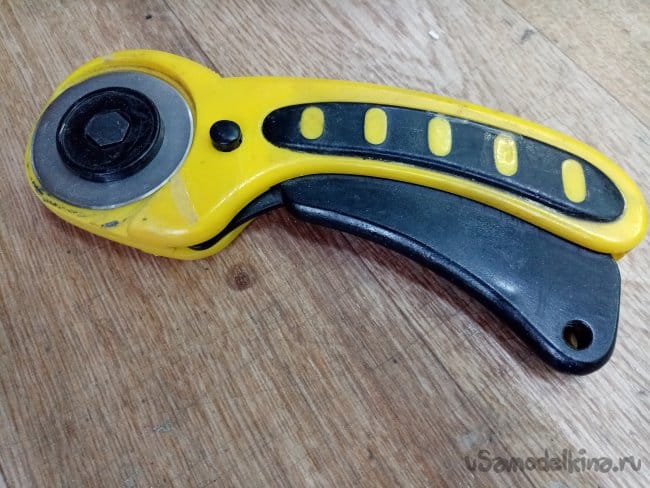 Режем прямо по скотчу роликовым ножом на жестком картоне в качестве подложки.