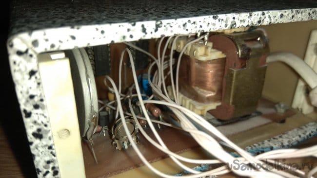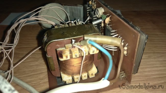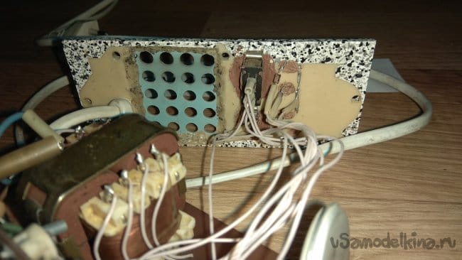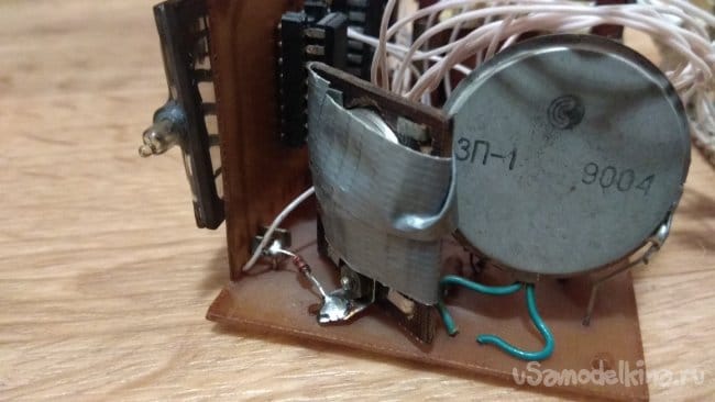 Для питания использовал трансформатор от списанного калькулятора с вакуумными индикаторами. У него как раз оказались все необходимые напряжения, ведь вакуумному индикатору для работы нужен накал. Под кембриком прячется предохранитель припаянный напрямую к трансформатору.