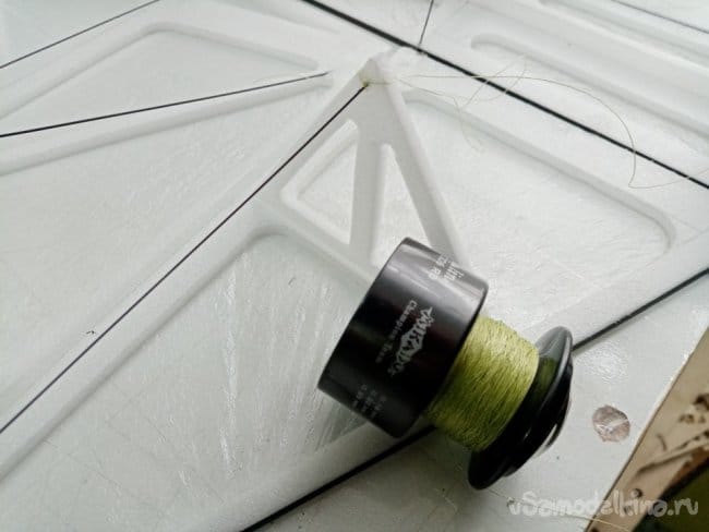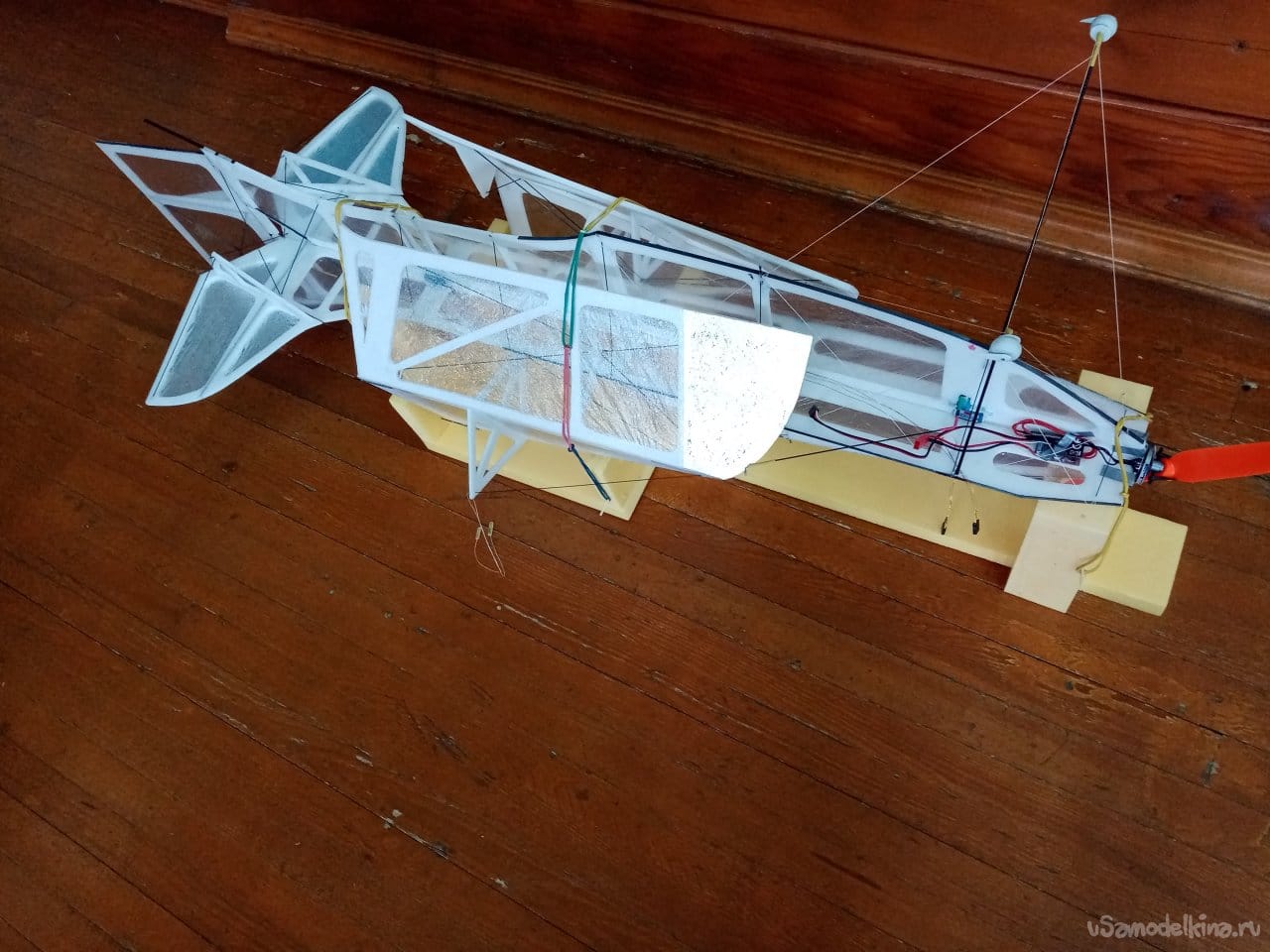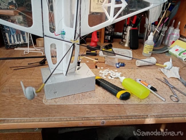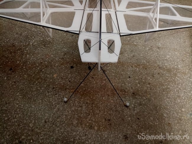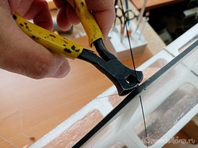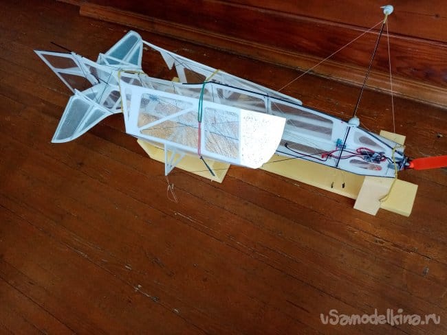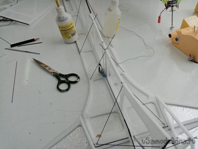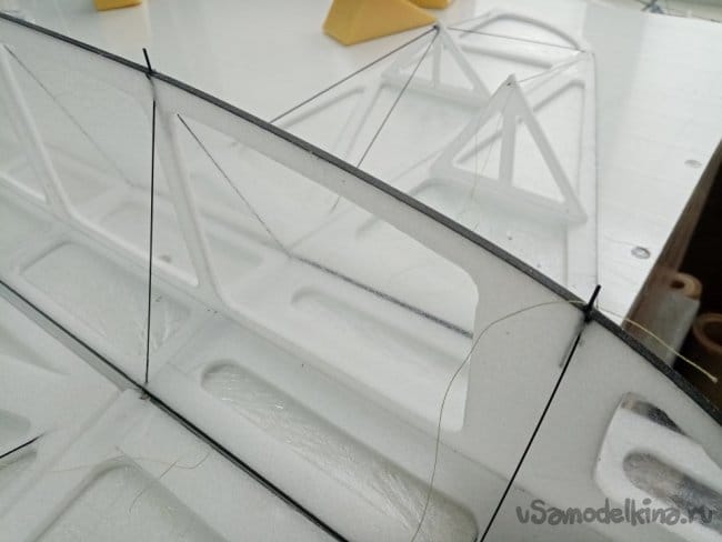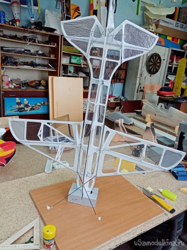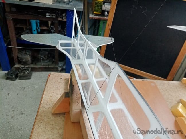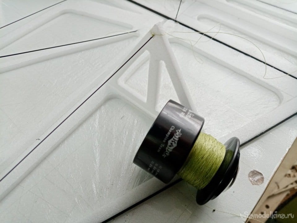 Устанавливаю самолетик в вертикальный стапель, закрепляю оттяжки крыльев с обратной стороны. Затем из арамидной нити монтирую усиления фюзеляжа крест на крест закрепляя титаном или циакрином.