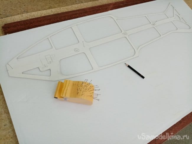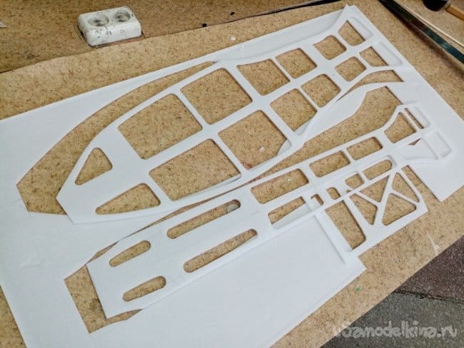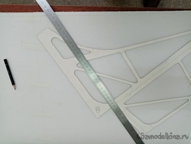 Вертикальные пластины фюзеляжа разметил. Горизонтальные немного изменяю. Предыдущая конструкция крепления крыла была цельная. Сейчас буду делать съемными. Провожу линию отреза крыльев, и немного изменяю рисунок силовых элементов на краю, прилегающему к фюзеляжу.