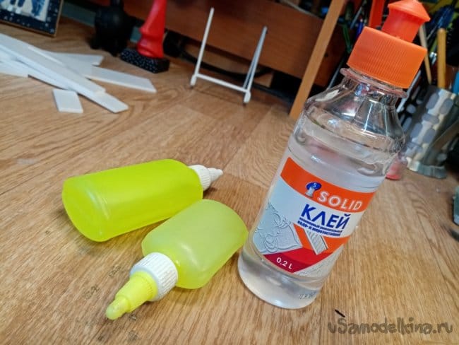 Клей для удобства разливаю в маленькие бутылочки, в одной клей густой, в другой разбавленный. При работе, нужна разная консистенция. Использую флаконы из под канцелярского ПВА, промываю, просушиваю. К тому-же у них тонкие носики, удобно наносить клей.