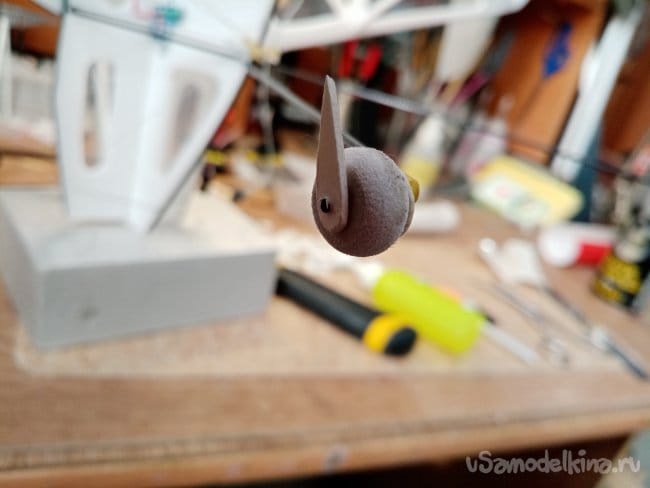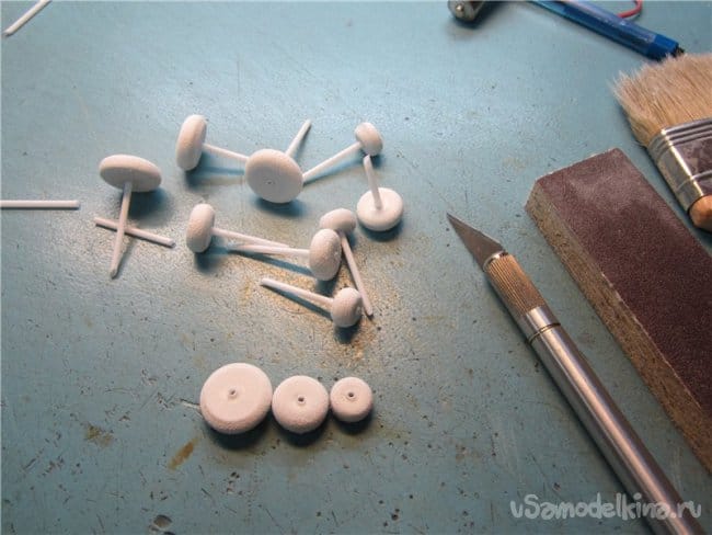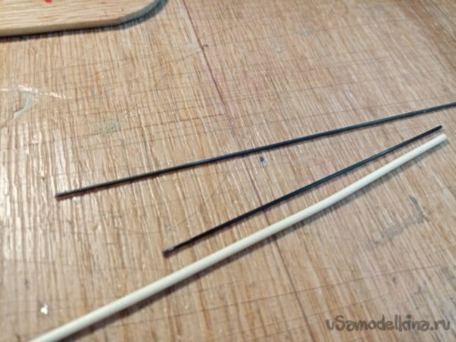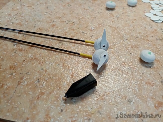 На шасси пошли тонкие кончики рыболовных хлыстиков. Нужно покупать трубочки, а не цельные хлыстики, они легче. Колесики изготовлены из пористой резины с осями-трубочками от ушных палочек на циакрине.
