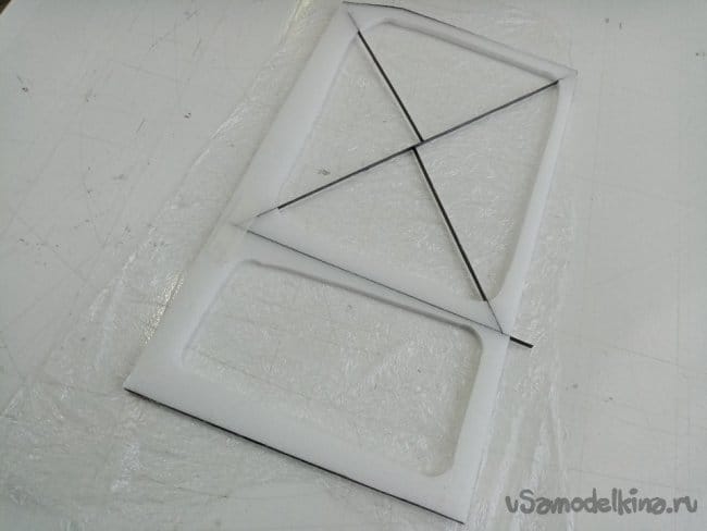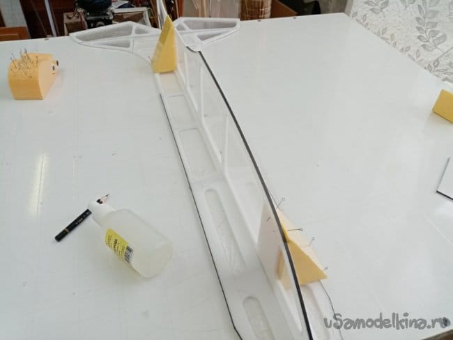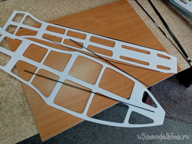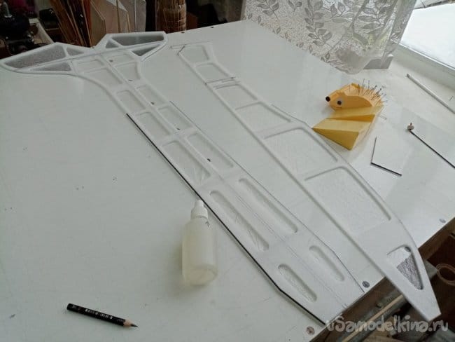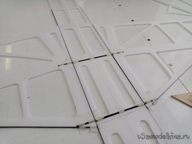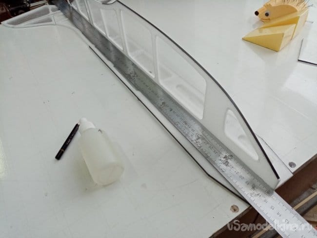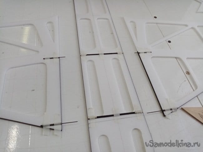 Последняя операция, разрезаю по линии и вклеиваю карбоновую рейку усиления размером 0.5х3 мм.
