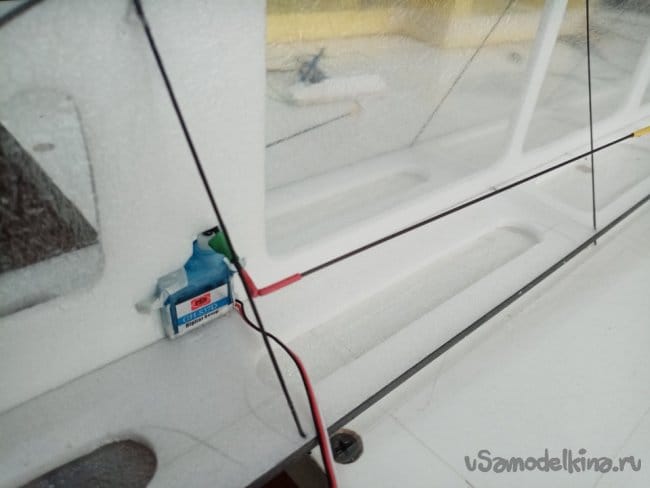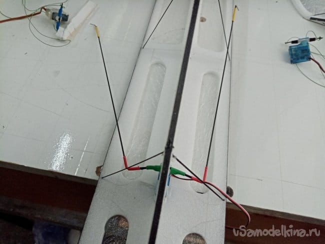 Нужно устанавливать по местам. На качалку сервы управления элеронами закрепляю при помощи термоусадки и циакрина слегка согнутый угольный прутик. Почему согнутый. Угол между этим прутиком и тягой управления элеронами должен составлять 90 градусов. Иначе они будут отклоняться на разные углы, это я про кривую "бочку".