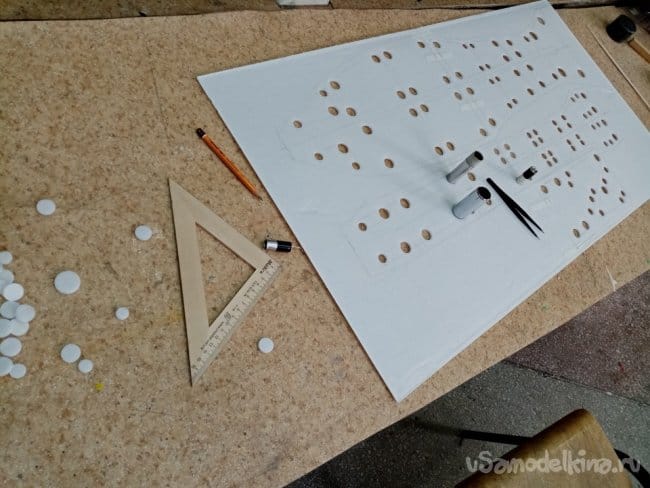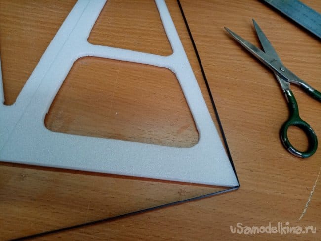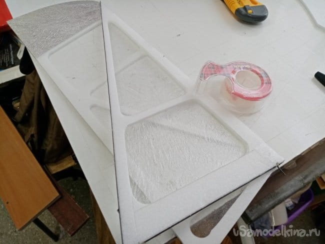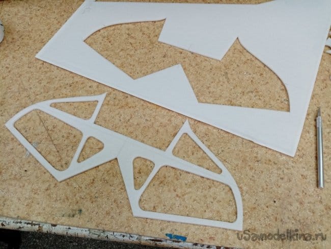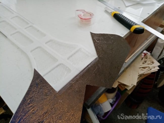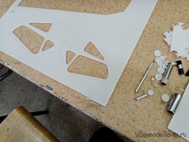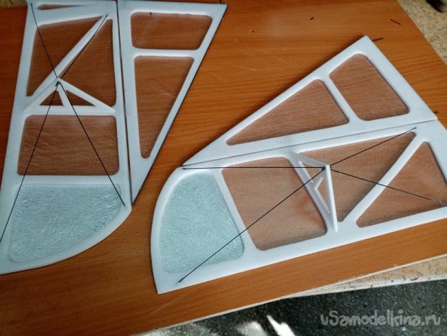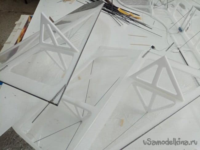 Устанавливаю усиления на крылья и элероны. Пока только с одной стороны. Вертикальные треугольники по известной уже технологии. Размечаю на обратной стороне потолочной плитки. прорезаю трубочками сопряжения, затем все внутренние части и под конец внешний контур.