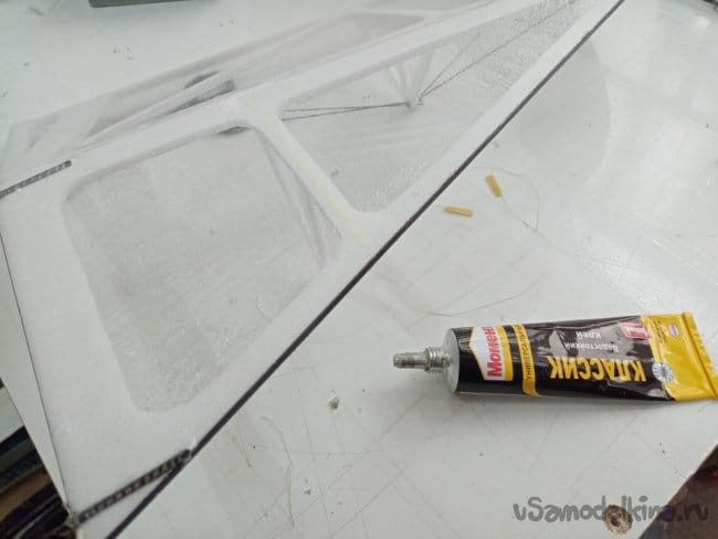 С одной стороны все установлено. Затем приклеиваю треугольники усиления с обратной стороны крыльев по пленке с применением Момента супер кристалл.