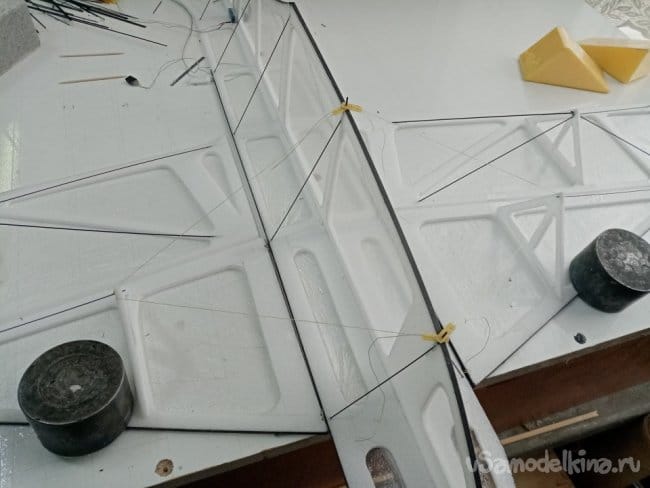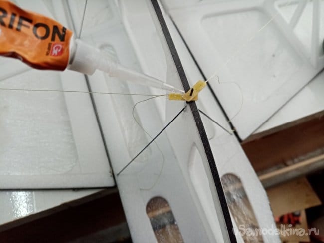 "Тросы" крепления изготовил из рыболовной плетенки 03. Монтирую на треугольник усиления. Соединяю в кучу крылья и фюзеляж. Устанавливаю грузы, ничего не должно трепыхаться при ответственной операцией. Продеваю плетенку в три отверстия пластины буквой "зю", Такой прием дает возможность натягивать плетенку на откатывая назад. Когда все подтянуто и ровно фиксирую циакрином.