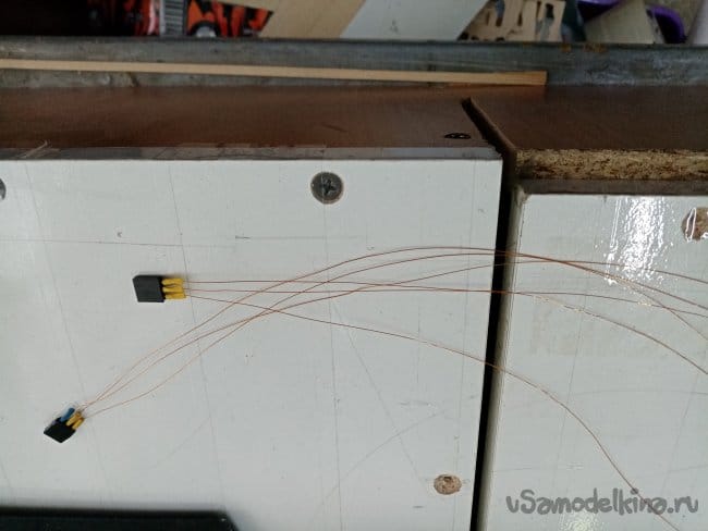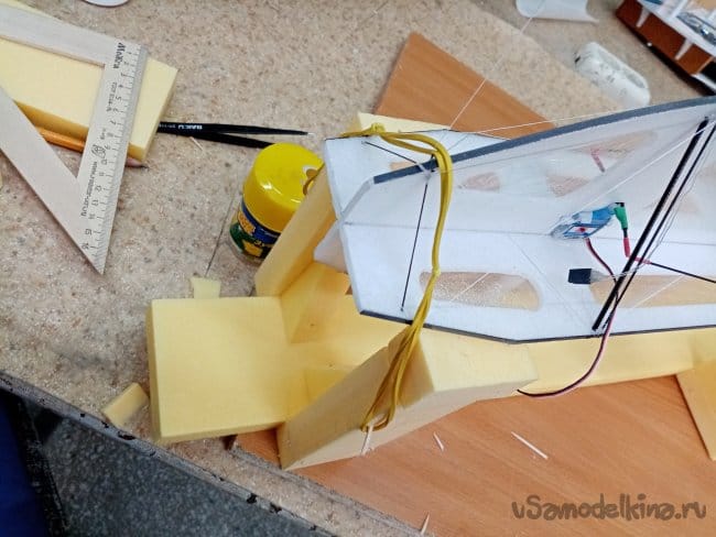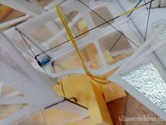 Для облегчения, все корпуса с приемников и регуляторов снимаю, на самолетике они закрепляются при помощи двойного скотча. Провода управления от сервоприводов прокидываю тонким лаковым проводом. Моторамы как таковой нет. Мотор закрепляю на армированный скотч.
