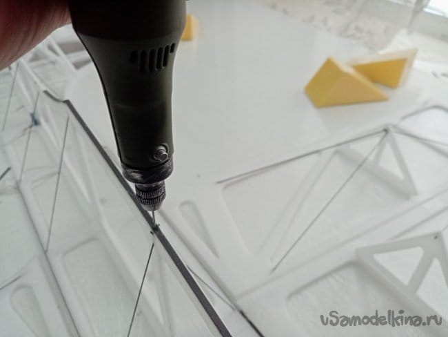 Сейчас начинаю монтировать "тросы" крепления крыла. Пока только с одной стороны. Поскольку в этом случае легко контролировать плоскость установки крыльев. В угольной пластине усиления сверлю минимотом отверстие в 1мм. Вклеиваю прутик.