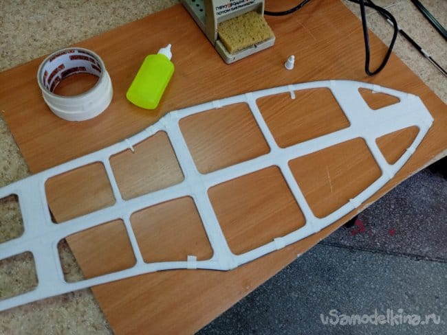 Когда все элементы оклеены "жеванной" пленкой. Нужно собирать вертикальные и горизонтальные плоскости фюзеляжа. Разметка линии склейки у меня уже нанесена. Разрезаю вертикальный на две половины. Со стороны пенопласта приклеиваю на титан. Со стороны пленки на Момент супер кристалл. Но он плавит пенопласт. Использую "фирменный" прием, клей тонко наношу на пленку, её не разъедает. По инструкции выдерживаю 15 минут, затем приклеиваю вертикальную. Загустевший практически не разъедает торец пенопластовой пластины. Для более точной приклейки по линии использую тяжелую металлическую линейку. Вертикальность придерживаю при помощи треугольников вырезанных из утеплителя и оклеенных скотчем для защиты от клея и иголок из ёжика.
