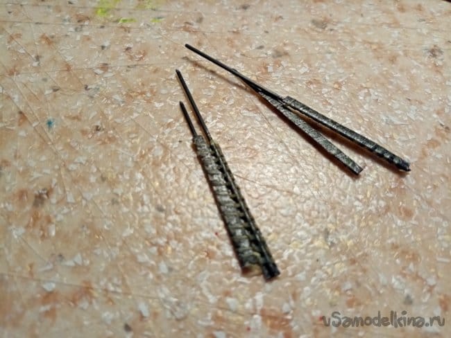 Когда детали фюзеляжа немного просохли нужно вставлять вертикальные элементы усиления угольных из прутков 0.5 мм. В основном извлекаю вторичное сырье из шахты. Очищаю от клея, устанавливаю. Частично приходится использовать новые палочки.