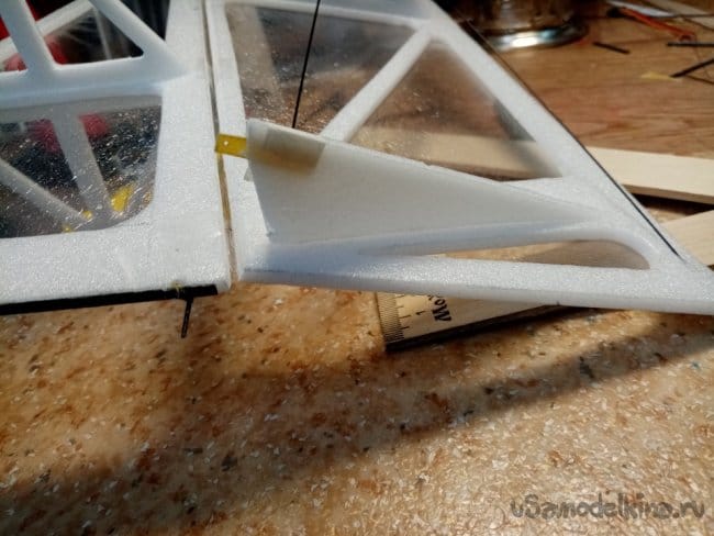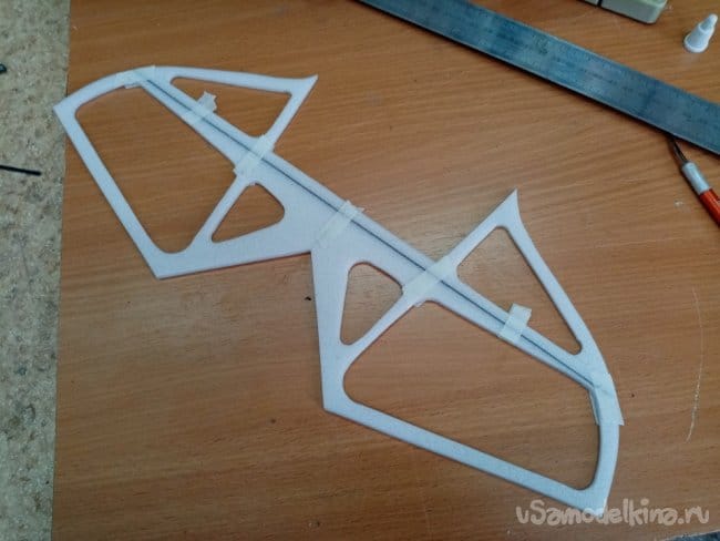 Пока прихватываются вертикальные элементы навешиваю на скотч элероны. Позиционирую их на расстоянии в 1 мм от края крыла. Чтобы не сдвигались во время такой ответственной процедуры прижимаю палками. Приклеиваю полосу по внешней стороне, затем складываю элерон и четырьмя полосками скотча фиксирую с обратной стороны.