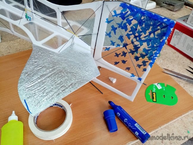 Руль высоты и кончики крыльев решил оклеить металлизированной пленкой.
