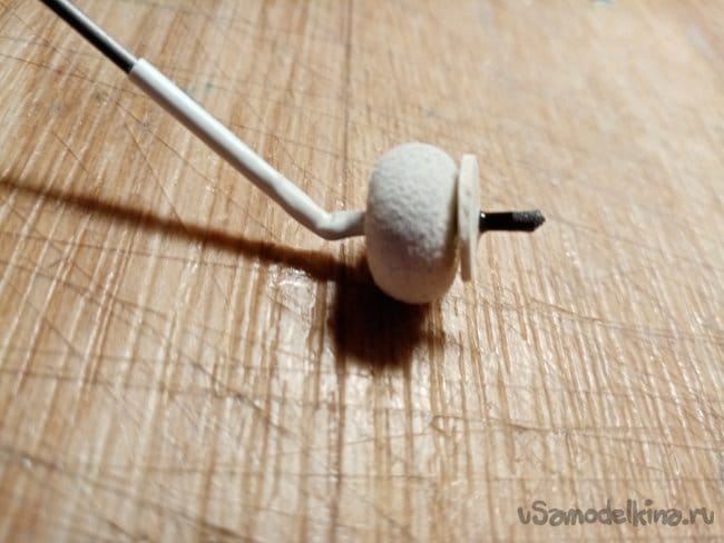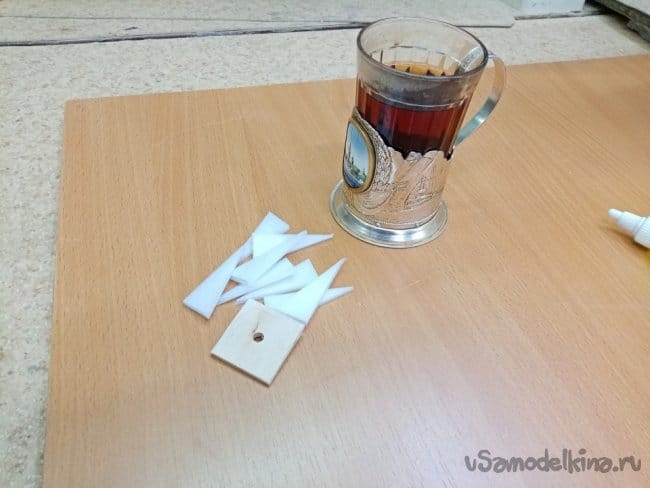 Кончики прутиков срезаю ножницами наискосок и протыкаю пенопласт в нужных местах. Наношу клей и окончательно фиксирую. Затем обрезаю в нужный размер кусачками. Оставляю все окончательно заклеиться на ночь.