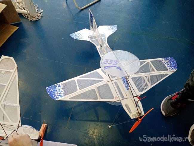 Конечно название «скелетон» интересное, но не совсем точно отображает концепцию этой модели. Построен максимально облегченный аппарат по пенопластовой технологии с усилениями из карбона, с применением сверхлегкой пленки как конструкционного материала. Предназначен для выполнения соревновательных полетов в зале, комплекса упражнений F3P.