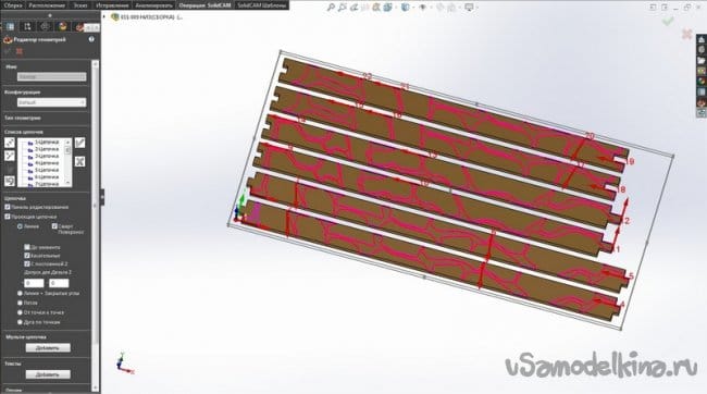 Создаю первую обработку. В дереве технологий выбираю обработку кармана и указываю нужные цепочки. Именно в той же последовательности будет работать станок. Часто это важно, например когда для экономии материала детали в сборке вставляются одна в другую (имеется в виду мелкая в свободное место более крупной).