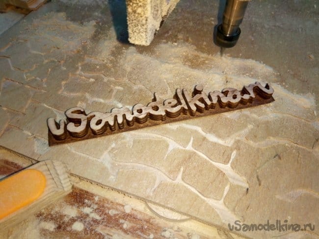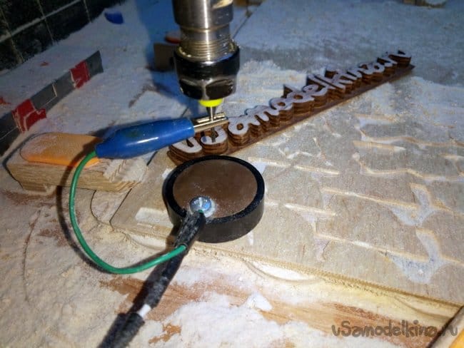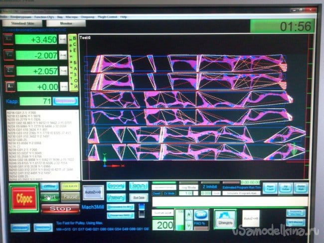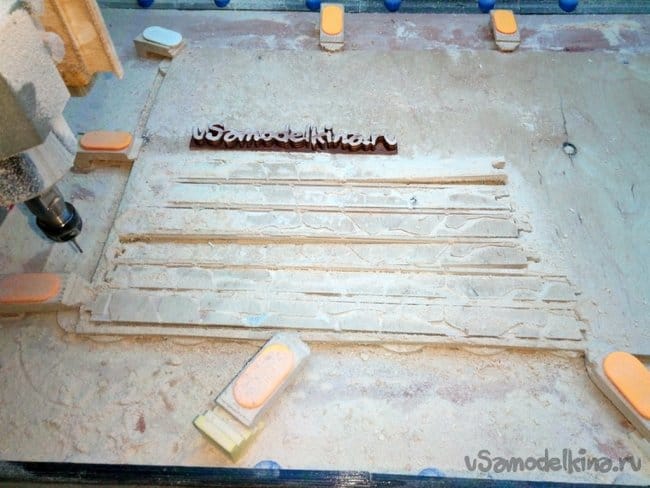Дальше передаю готовую программу на станок. Креплю на рабочем столе заготовку, выставляю машинный "0", и запускаю обработку.